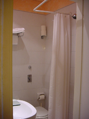 下は、浴槽があるわけでなく、トイレと同じ床である。シャワーの水がはねるとベッドルームまで流れていく。